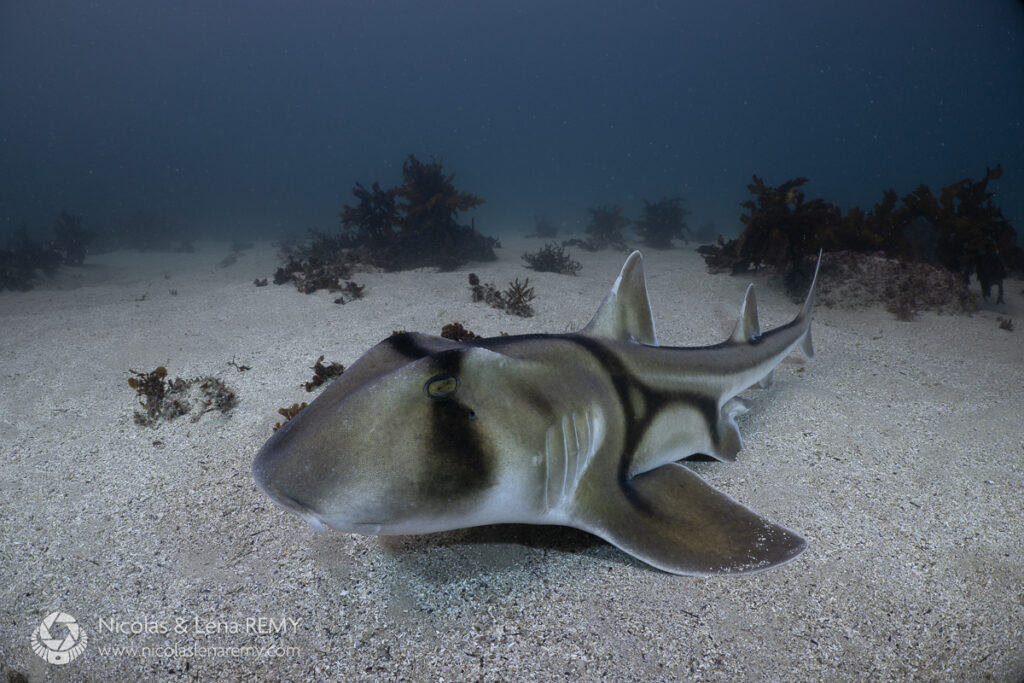 The ambient blue diffusers are an interesting beast: Despite maxing out Lightroom’s tint correction towards the right, the strobe-lit sand still looks desaturated compared to the earlier photos, because of the lack of red in the light. This results in the water having a slight magenta tint (easily corrected with Lightroom’s HSL sliders), which doesn’t appear in the last image (ambient light only), because it hasn’t been color-biased by that blue light. But let’s go back to the drawing board: These blue diffusers are designed to mimick tropical ambient light in depths between 10 and 30 feet, so using them in temperate waters was a tad more experimental. I did prefer the look of the images at slightly shallower depths (18 feet), which is where I photographed the Port Jackson shark in the next image.