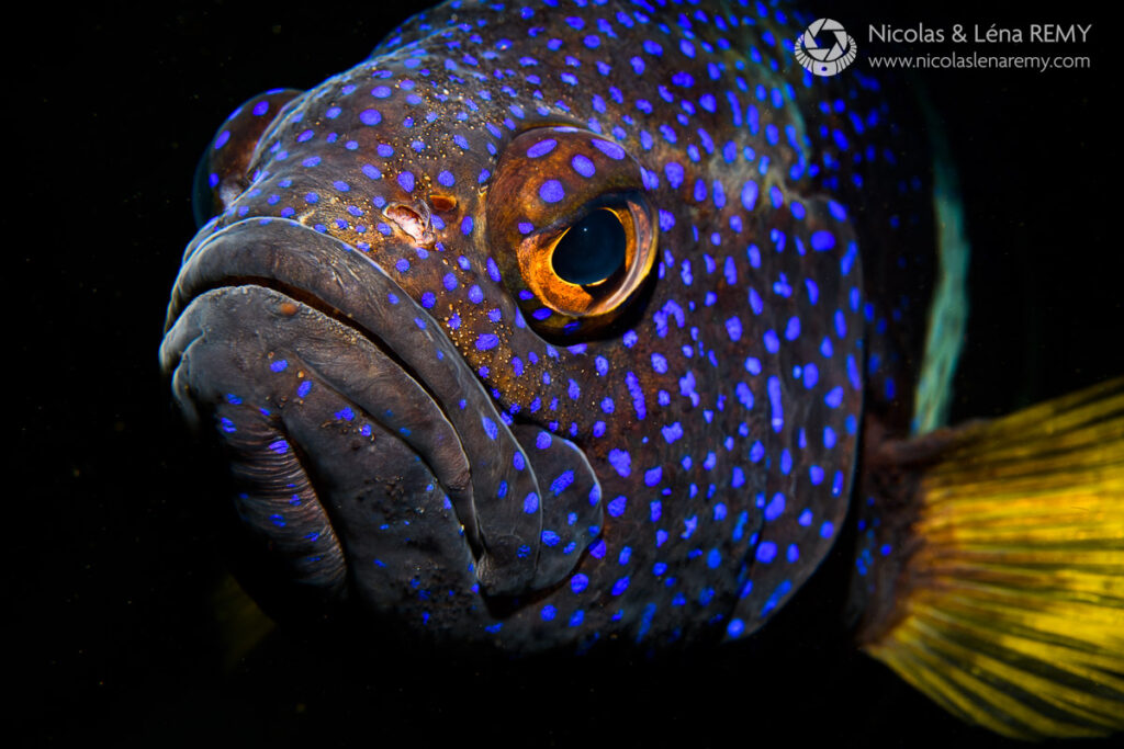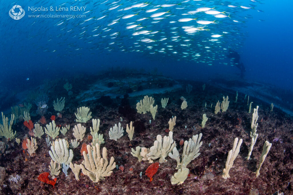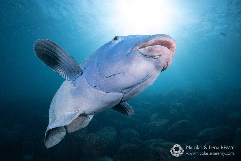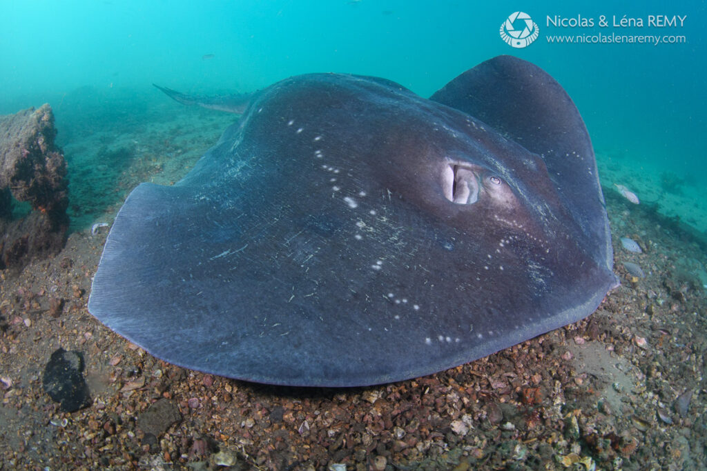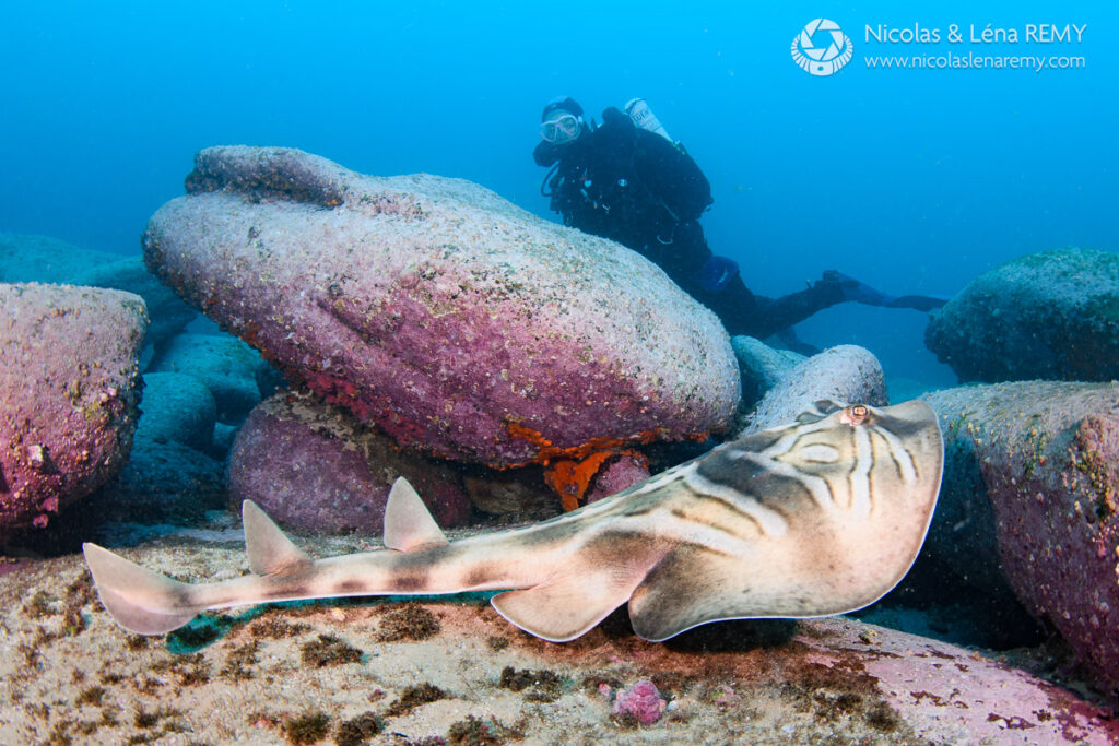 If you’re a wide-angle shooter, our friendly blue gropers who will most likely find you, and come up-close in hope for a feed (please refrain). You might also encounter giant cuttlefish, elegant fiddler rays (also called banjo rays, due to their guitar-shape) and awe-inspiring “bull rays” (smooth stingrays) which can be 2 meters wide (6.6 ft), 4m (13 ft) long and weigh over 300kg (660 lbs).