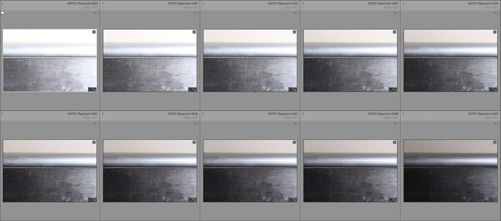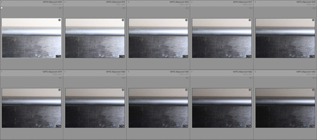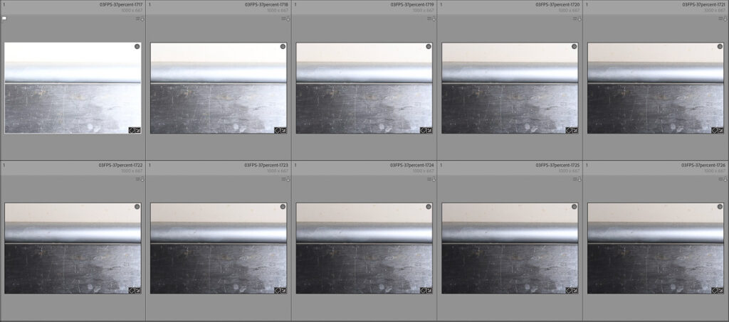 This article would get very boring if I included every test shot, but here are a few examples showing the first 10 shots, at various settings (NB: I’ve changed exposure parameters between series, what matters is the consistency within a series).