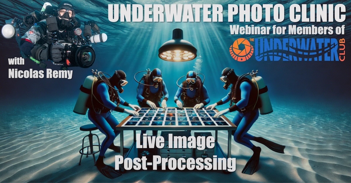 - Underwater Photo Clinic – get help post-processing your photos, with Nicolas Remy